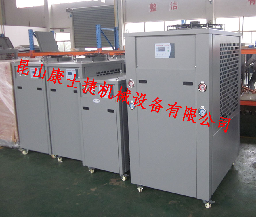目前工廠使用最多的便是注塑機,塑膠粒經加熱溶化后注入模具中,凝結后,開模頂出成型塑膠工件,在連續生產過程中有需用對模具進行冷卻,以縮短塑膠凝結時間,提高工件尺寸精度,成型質量、表面質量。而在早期,很多用戶選用冷卻水塔為其降溫,這種冷卻方式只適合在環境溫度較低的情況下達到降溫目的,一旦環境溫度升高,則無法保證產品精度。因此,就需要使用到冷水機
